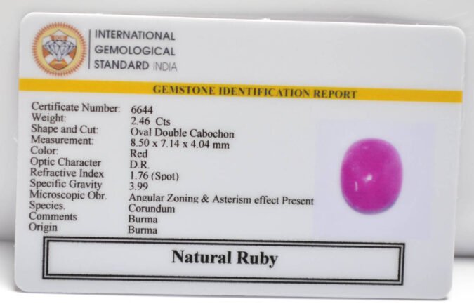 Beautiful 2.46 Cts Natural Ruby (AAA+-Mines) sva 2+ Ratti RUBY (BURMA MINES). Free Horoscope & Free Pundit Ji Astrological Advise / Consultation. Original Natural Lab certified gems by IGI GTL / Birth stones / Large Gem Selection of shree shubh Rashi Ratan Vedic dhan at Gem Mines. May Bhagwan Brahma, Vishnu, Shiv & Universe bless you.