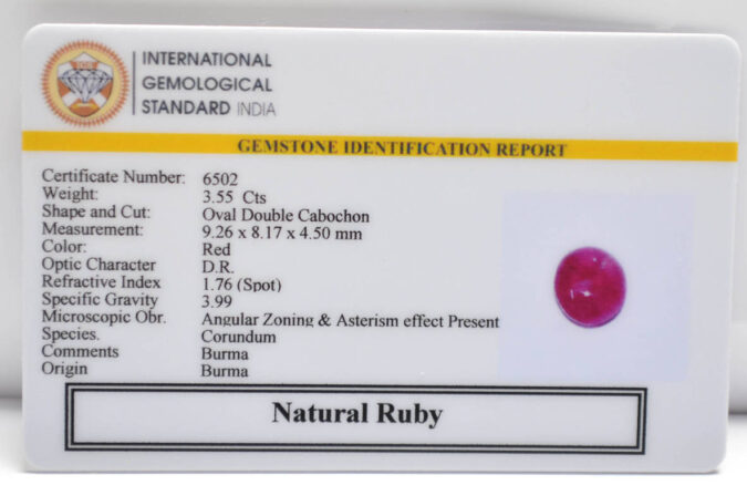 Beautiful 3.55 Cts Natural Ruby (AAA+-Mines) sva 3+ Ratti RUBY (BURMA MINES). Free Horoscope & Free Pundit Ji Astrological Advise / Consultation. Original Natural Lab certified gems by IGI GTL / Birth stones / Large Gem Selection of shree shubh Rashi Ratan Vedic dhan at Gem Mines. May Bhagwan Brahma, Vishnu, Shiv & Universe bless you.