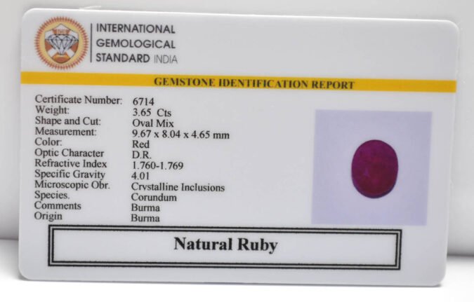 Beautiful 3.65 Cts Natural Ruby (AAA+-Mines) sva 4+ Ratti RUBY (BURMA MINES). Free Horoscope & Free Pundit Ji Astrological Advise / Consultation. Original Natural Lab certified gems by IGI GTL / Birth stones / Large Gem Selection of shree shubh Rashi Ratan Vedic dhan at Gem Mines. May Bhagwan Brahma, Vishnu, Shiv & Universe bless you.