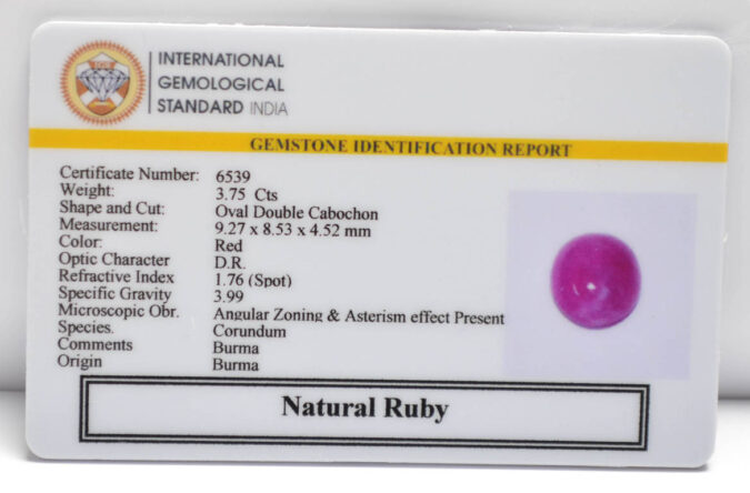 Beautiful 3.75 Cts Natural Ruby (Top-Mines) sva 4+ Ratti RUBY (BURMA MINES). Free Horoscope & Free Pundit Ji Astrological Advise / Consultation. Original Natural Lab certified gems by IGI GTL / Birth stones / Large Gem Selection of shree shubh Rashi Ratan Vedic dhan at Gem Mines. May Bhagwan Brahma, Vishnu, Shiv & Universe bless you.