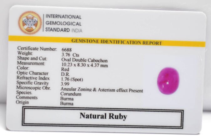 Beautiful 3.76 Cts Natural Ruby (Top-Mines) sva 4+ Ratti RUBY (BURMA MINES). Free Horoscope & Free Pundit Ji Astrological Advise / Consultation. Original Natural Lab certified gems by IGI GTL / Birth stones / Large Gem Selection of shree shubh Rashi Ratan Vedic dhan at Gem Mines. May Bhagwan Brahma, Vishnu, Shiv & Universe bless you.
