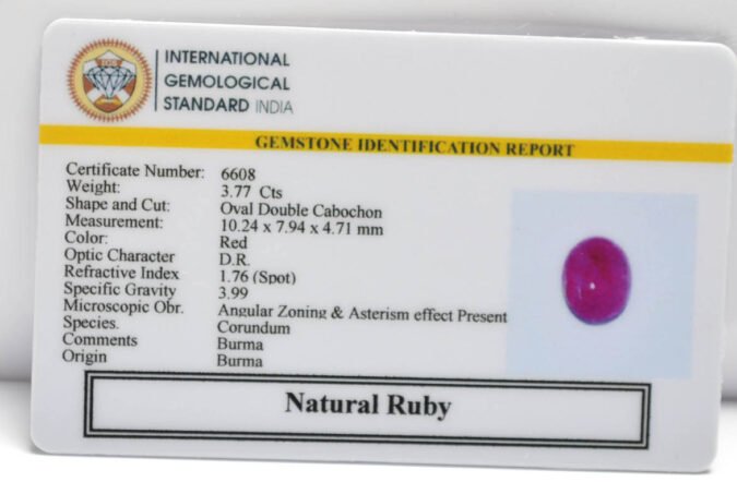 Beautiful 3.77 Cts Natural Ruby (Top-Mines) sva 4+ Ratti RUBY (BURMA MINES). Free Horoscope & Free Pundit Ji Astrological Advise / Consultation. Original Natural Lab certified gems by IGI GTL / Birth stones / Large Gem Selection of shree shubh Rashi Ratan Vedic dhan at Gem Mines. May Bhagwan Brahma, Vishnu, Shiv & Universe bless you.