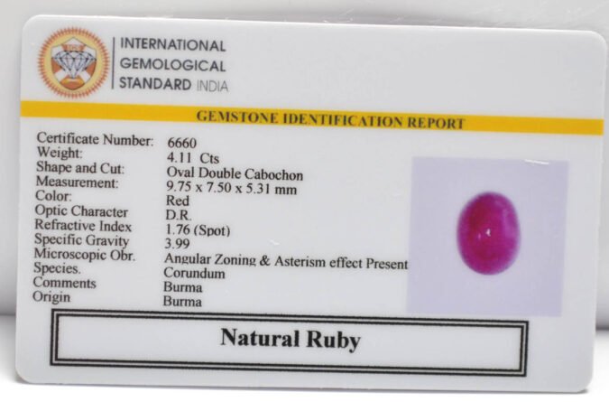 Beautiful 4.11 Cts Natural Ruby (AAA+-Mines) sva 4+ Ratti RUBY (BURMA MINES). Free Horoscope & Free Pundit Ji Astrological Advise / Consultation. Original Natural Lab certified gems by IGI GTL / Birth stones / Large Gem Selection of shree shubh Rashi Ratan Vedic dhan at Gem Mines. May Bhagwan Brahma, Vishnu, Shiv & Universe bless you.