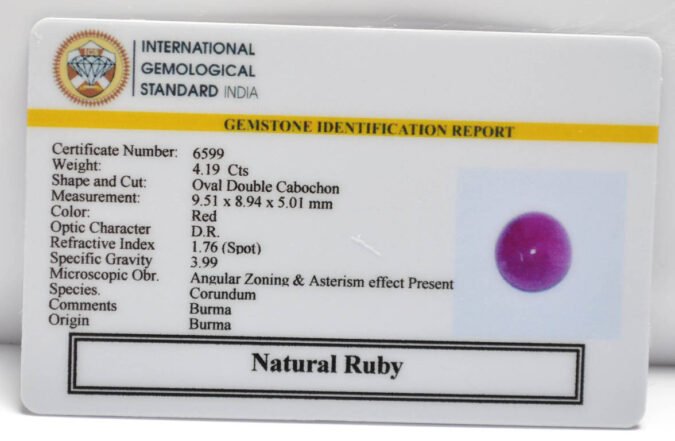 Beautiful 4.19 Cts Natural Ruby (Top-Mines) sva 4+ Ratti RUBY (BURMA MINES). Free Horoscope & Free Pundit Ji Astrological Advise / Consultation. Original Natural Lab certified gems by IGI GTL / Birth stones / Large Gem Selection of shree shubh Rashi Ratan Vedic dhan at Gem Mines. May Bhagwan Brahma, Vishnu, Shiv & Universe bless you.