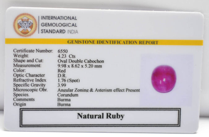 Beautiful 4.23 Cts Natural Ruby (Top-Mines) sva 4+ Ratti RUBY (BURMA MINES). Free Horoscope & Free Pundit Ji Astrological Advise / Consultation. Original Natural Lab certified gems by IGI GTL / Birth stones / Large Gem Selection of shree shubh Rashi Ratan Vedic dhan at Gem Mines. May Bhagwan Brahma, Vishnu, Shiv & Universe bless you.