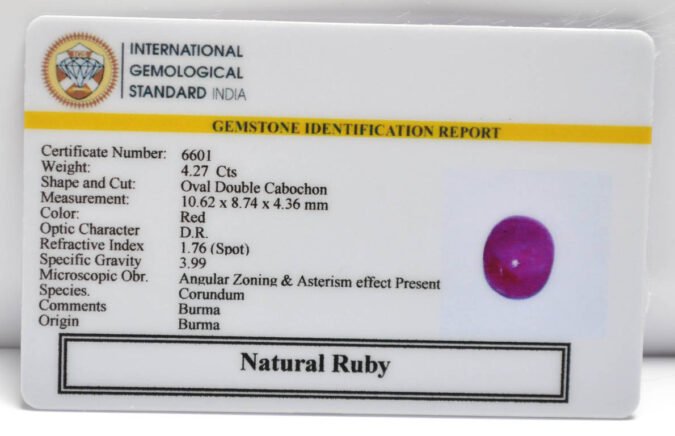 Beautiful 4.27 Cts Natural Ruby (Top-Mines) sva 4+ Ratti RUBY (BURMA MINES). Free Horoscope & Free Pundit Ji Astrological Advise / Consultation. Original Natural Lab certified gems by IGI GTL / Birth stones / Large Gem Selection of shree shubh Rashi Ratan Vedic dhan at Gem Mines. May Bhagwan Brahma, Vishnu, Shiv & Universe bless you.