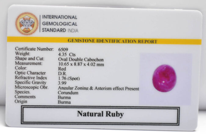 Beautiful 4.35 Cts Natural Ruby (AAA+-Mines) sva 4+ Ratti RUBY (BURMA MINES). Free Horoscope & Free Pundit Ji Astrological Advise / Consultation. Original Natural Lab certified gems by IGI GTL / Birth stones / Large Gem Selection of shree shubh Rashi Ratan Vedic dhan at Gem Mines. May Bhagwan Brahma, Vishnu, Shiv & Universe bless you.