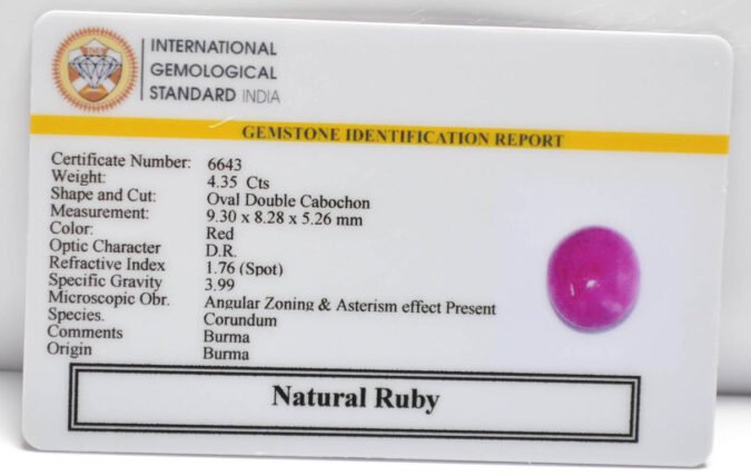 Beautiful 4.35 Cts Natural Ruby (AAA+-Mines) sva 4+ Ratti RUBY (BURMA MINES). Free Horoscope & Free Pundit Ji Astrological Advise / Consultation. Original Natural Lab certified gems by IGI GTL / Birth stones / Large Gem Selection of shree shubh Rashi Ratan Vedic dhan at Gem Mines. May Bhagwan Brahma, Vishnu, Shiv & Universe bless you.