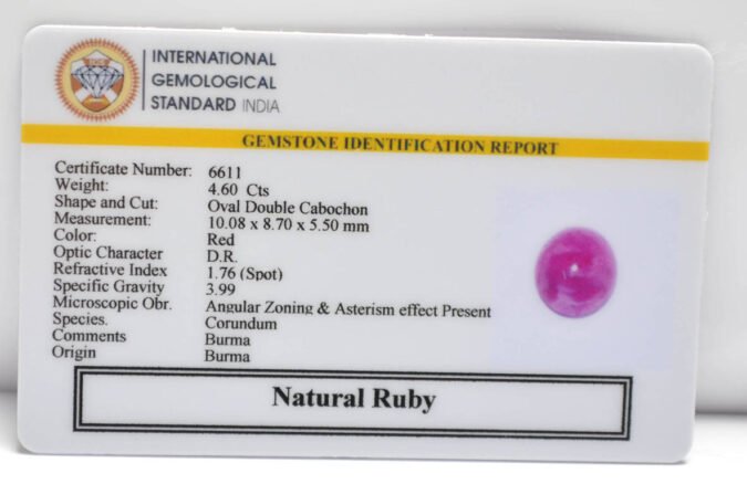 Beautiful 4.6 Cts Natural Ruby (Top-Mines) sva 5+ Ratti RUBY (BURMA MINES). Free Horoscope & Free Pundit Ji Astrological Advise / Consultation. Original Natural Lab certified gems by IGI GTL / Birth stones / Large Gem Selection of shree shubh Rashi Ratan Vedic dhan at Gem Mines. May Bhagwan Brahma, Vishnu, Shiv & Universe bless you.