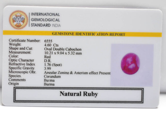 Beautiful 4.6 Cts Natural Ruby (Top-Mines) sva 5+ Ratti RUBY (BURMA MINES). Free Horoscope & Free Pundit Ji Astrological Advise / Consultation. Original Natural Lab certified gems by IGI GTL / Birth stones / Large Gem Selection of shree shubh Rashi Ratan Vedic dhan at Gem Mines. May Bhagwan Brahma, Vishnu, Shiv & Universe bless you.