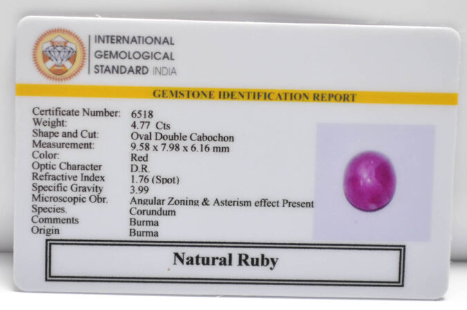 Beautiful 4.77 Cts Natural Ruby (AAA+-Mines) sva 5+ Ratti RUBY (BURMA MINES). Free Horoscope & Free Pundit Ji Astrological Advise / Consultation. Original Natural Lab certified gems by IGI GTL / Birth stones / Large Gem Selection of shree shubh Rashi Ratan Vedic dhan at Gem Mines. May Bhagwan Brahma, Vishnu, Shiv & Universe bless you.