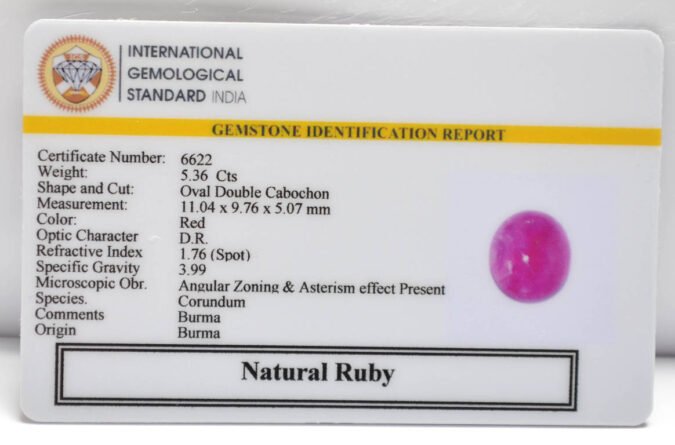 Beautiful 5.36 Cts Natural Ruby (Top+-Mines) sva 5+ Ratti RUBY (BURMA MINES). Free Horoscope & Free Pundit Ji Astrological Advise / Consultation. Original Natural Lab certified gems by IGI GTL / Birth stones / Large Gem Selection of shree shubh Rashi Ratan Vedic dhan at Gem Mines. May Bhagwan Brahma, Vishnu, Shiv & Universe bless you.