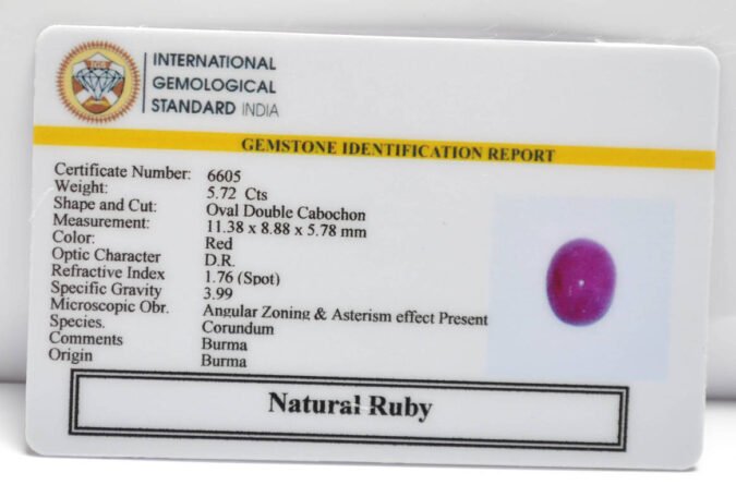 Beautiful 5.72 Cts Natural Ruby (Top-Mines) sva 6+ Ratti RUBY (BURMA MINES). Free Horoscope & Free Pundit Ji Astrological Advise / Consultation. Original Natural Lab certified gems by IGI GTL / Birth stones / Large Gem Selection of shree shubh Rashi Ratan Vedic dhan at Gem Mines. May Bhagwan Brahma, Vishnu, Shiv & Universe bless you.