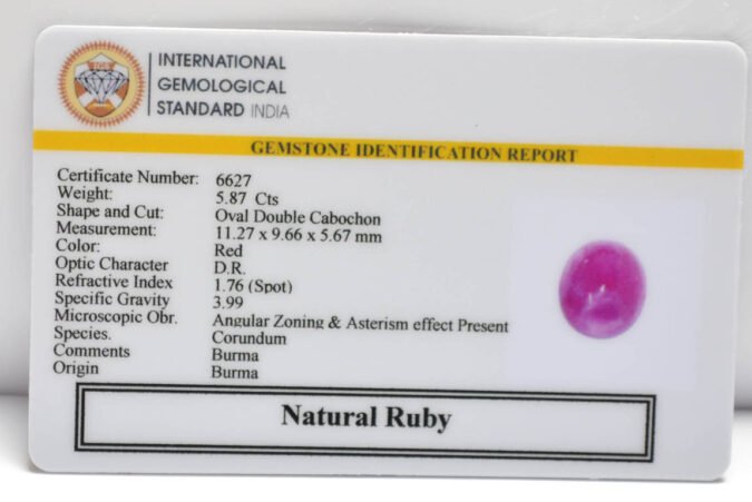 Beautiful 5.87 Cts Natural Ruby (Top+-Mines) sva 6+ Ratti RUBY (BURMA MINES). Free Horoscope & Free Pundit Ji Astrological Advise / Consultation. Original Natural Lab certified gems by IGI GTL / Birth stones / Large Gem Selection of shree shubh Rashi Ratan Vedic dhan at Gem Mines. May Bhagwan Brahma, Vishnu, Shiv & Universe bless you.