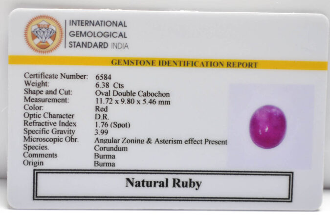 Beautiful 6.38 Cts Natural Ruby (Top-Mines) sva 7+ Ratti RUBY (BURMA MINES). Free Horoscope & Free Pundit Ji Astrological Advise / Consultation. Original Natural Lab certified gems by IGI GTL / Birth stones / Large Gem Selection of shree shubh Rashi Ratan Vedic dhan at Gem Mines. May Bhagwan Brahma, Vishnu, Shiv & Universe bless you.