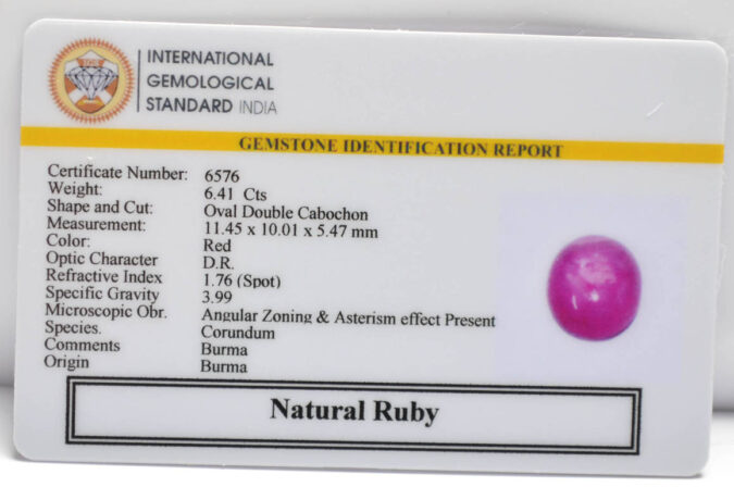 Beautiful 6.41 Cts Natural Ruby (Top+-Mines) sva 7+ Ratti RUBY (BURMA MINES). Free Horoscope & Free Pundit Ji Astrological Advise / Consultation. Original Natural Lab certified gems by IGI GTL / Birth stones / Large Gem Selection of shree shubh Rashi Ratan Vedic dhan at Gem Mines. May Bhagwan Brahma, Vishnu, Shiv & Universe bless you.