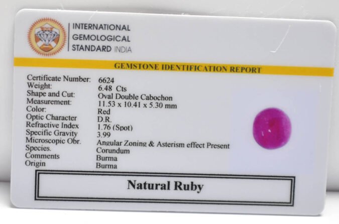 Beautiful 6.48 Cts Natural Ruby (Top+-Mines) sva 7+ Ratti RUBY (BURMA MINES). Free Horoscope & Free Pundit Ji Astrological Advise / Consultation. Original Natural Lab certified gems by IGI GTL / Birth stones / Large Gem Selection of shree shubh Rashi Ratan Vedic dhan at Gem Mines. May Bhagwan Brahma, Vishnu, Shiv & Universe bless you.
