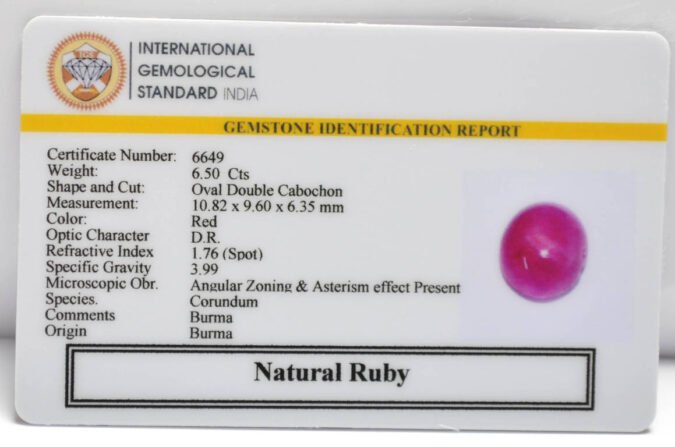 Beautiful 6.5 Cts Natural Ruby (AAA+-Mines) sva 7+ Ratti RUBY (BURMA MINES). Free Horoscope & Free Pundit Ji Astrological Advise / Consultation. Original Natural Lab certified gems by IGI GTL / Birth stones / Large Gem Selection of shree shubh Rashi Ratan Vedic dhan at Gem Mines. May Bhagwan Brahma, Vishnu, Shiv & Universe bless you.