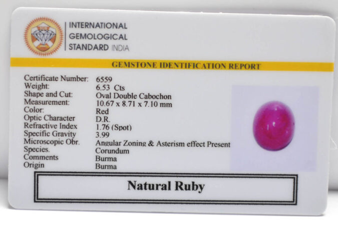 Beautiful 6.53 Cts Natural Ruby (Top-Mines) sva 7+ Ratti RUBY (BURMA MINES). Free Horoscope & Free Pundit Ji Astrological Advise / Consultation. Original Natural Lab certified gems by IGI GTL / Birth stones / Large Gem Selection of shree shubh Rashi Ratan Vedic dhan at Gem Mines. May Bhagwan Brahma, Vishnu, Shiv & Universe bless you.