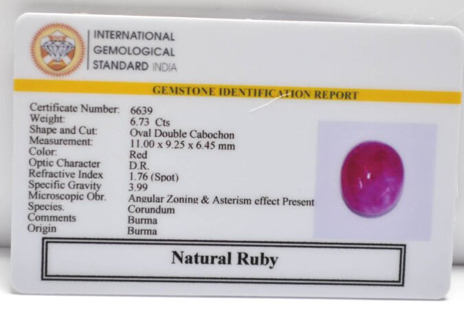 Beautiful 6.73 Cts Natural Ruby (Top+-Mines) sva 7+ Ratti RUBY (BURMA MINES). Free Horoscope & Free Pundit Ji Astrological Advise / Consultation. Original Natural Lab certified gems by IGI GTL / Birth stones / Large Gem Selection of shree shubh Rashi Ratan Vedic dhan at Gem Mines. May Bhagwan Brahma, Vishnu, Shiv & Universe bless you.