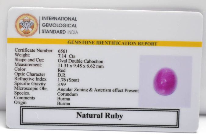 Beautiful 7.14 Cts Natural Ruby (Top-Mines) sva 7+ Ratti RUBY (BURMA MINES). Free Horoscope & Free Pundit Ji Astrological Advise / Consultation. Original Natural Lab certified gems by IGI GTL / Birth stones / Large Gem Selection of shree shubh Rashi Ratan Vedic dhan at Gem Mines. May Bhagwan Brahma, Vishnu, Shiv & Universe bless you.