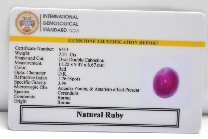 Beautiful 7.21 Cts Natural Ruby (AAA+-Mines) sva 8+ Ratti RUBY (BURMA MINES). Free Horoscope & Free Pundit Ji Astrological Advise / Consultation. Original Natural Lab certified gems by IGI GTL / Birth stones / Large Gem Selection of shree shubh Rashi Ratan Vedic dhan at Gem Mines. May Bhagwan Brahma, Vishnu, Shiv & Universe bless you.