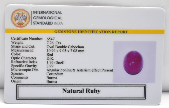 Beautiful 7.26 Cts Natural Ruby (Top-Mines) sva 8+ Ratti RUBY (BURMA MINES). Free Horoscope & Free Pundit Ji Astrological Advise / Consultation. Original Natural Lab certified gems by IGI GTL / Birth stones / Large Gem Selection of shree shubh Rashi Ratan Vedic dhan at Gem Mines. May Bhagwan Brahma, Vishnu, Shiv & Universe bless you.