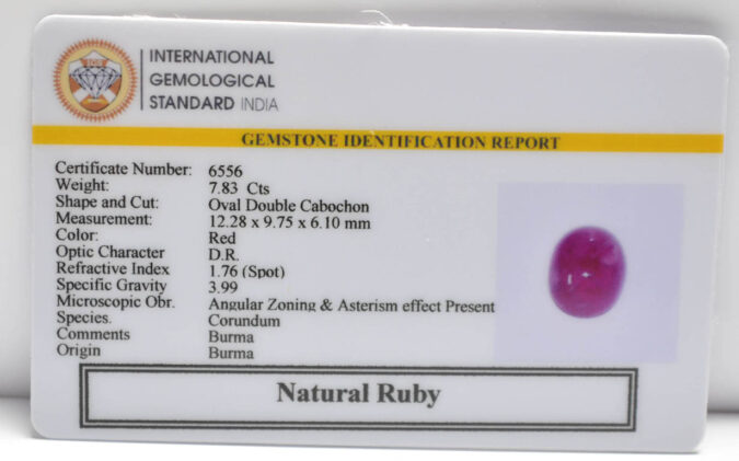 Beautiful 7.83 Cts Natural Ruby (Top+-Mines) sva 8+ Ratti RUBY (BURMA MINES). Free Horoscope & Free Pundit Ji Astrological Advise / Consultation. Original Natural Lab certified gems by IGI GTL / Birth stones / Large Gem Selection of shree shubh Rashi Ratan Vedic dhan at Gem Mines. May Bhagwan Brahma, Vishnu, Shiv & Universe bless you.