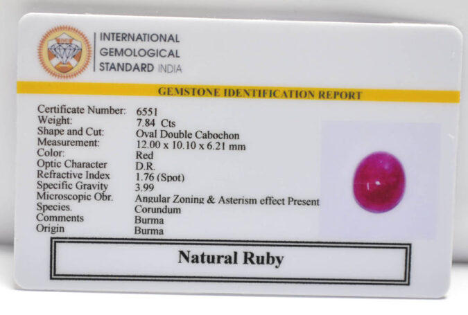 Beautiful 7.84 Cts Natural Ruby (Top+-Mines) sva 8+ Ratti RUBY (BURMA MINES). Free Horoscope & Free Pundit Ji Astrological Advise / Consultation. Original Natural Lab certified gems by IGI GTL / Birth stones / Large Gem Selection of shree shubh Rashi Ratan Vedic dhan at Gem Mines. May Bhagwan Brahma, Vishnu, Shiv & Universe bless you.
