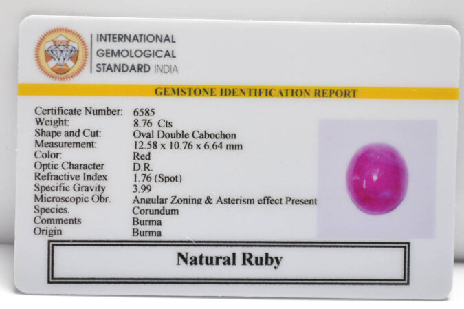 Beautiful 8.76 Cts Natural Ruby (Top-Mines) sva 9+ Ratti RUBY (BURMA MINES). Free Horoscope & Free Pundit Ji Astrological Advise / Consultation. Original Natural Lab certified gems by IGI GTL / Birth stones / Large Gem Selection of shree shubh Rashi Ratan Vedic dhan at Gem Mines. May Bhagwan Brahma, Vishnu, Shiv & Universe bless you.