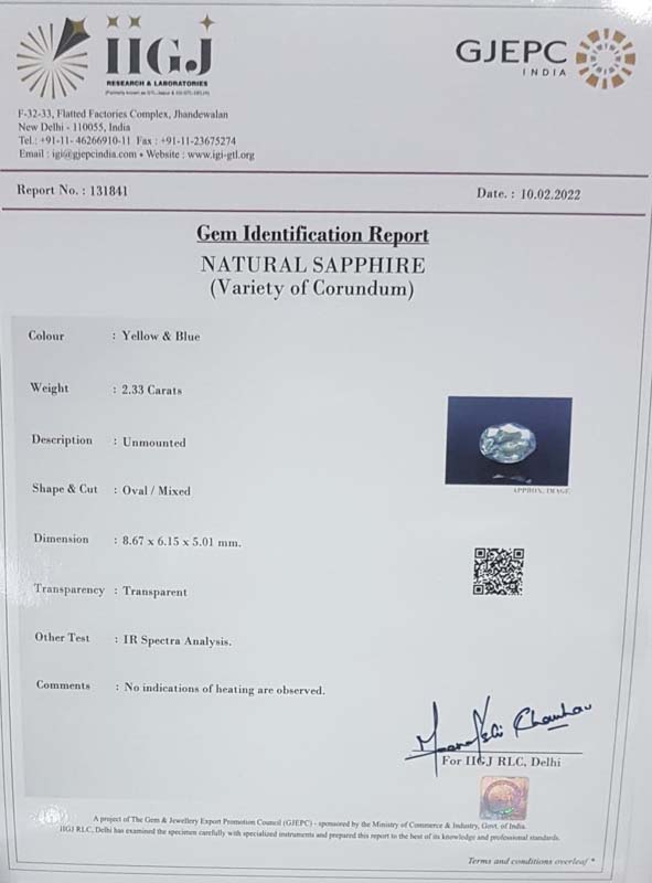 Beautiful 2.33 Ct. Sapphire (Ceylon(Sri-Lanka) Mines) Sava 2 Ratti Pukhraj. Free Horoscope & Free Pundit Ji Advise / Consultation. Original Natural Lab certified gems by IGI GTL / Birth stones / Large Gem Selection of shree shubh Rashi Ratan Vedic dhan at Gem Mines. May Bhagwan Brahma, Vishnu, Shiv & Universe bless you.
