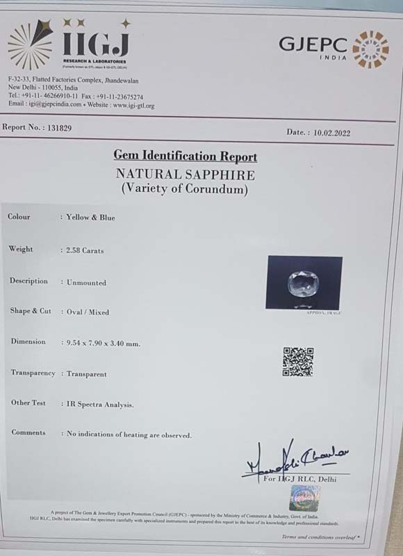 Beautiful 2.58 Ct. Sapphire (Ceylon(Sri-Lanka) Mines) Sava 2 Ratti Pukhraj. Free Horoscope & Free Pundit Ji Advise / Consultation. Original Natural Lab certified gems by IGI GTL / Birth stones / Large Gem Selection of shree shubh Rashi Ratan Vedic dhan at Gem Mines. May Bhagwan Brahma, Vishnu, Shiv & Universe bless you.