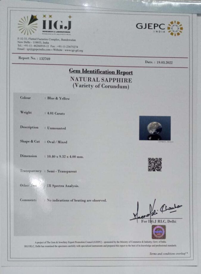 Beautiful 4.01 Ct. Sapphire (Ceylon (Sri Lanka) Mines) Sava 4 Ratti Pitambari Nilambari. Free Horoscope & Free Pundit Ji Advise / Consultation. Original Natural Lab certified gems by IGI GTL / Birth stones / Large Gem Selection of shree shubh Rashi Ratan Vedic dhan at Gem Mines. May Bhagwan Brahma, Vishnu, Shiv & Universe bless you.