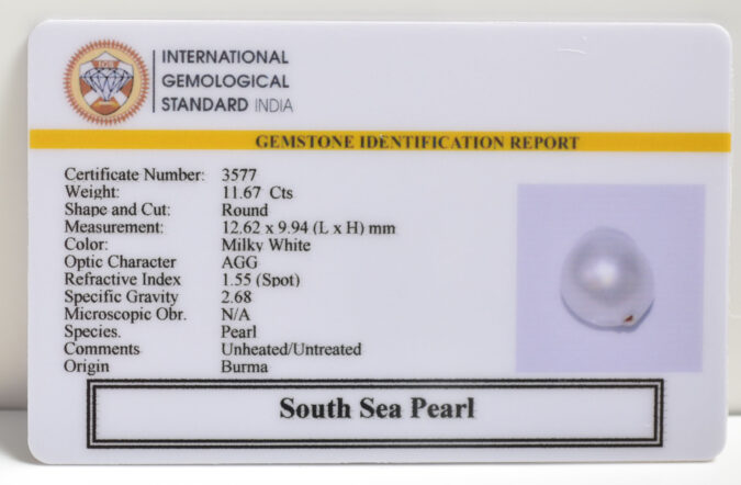 Beautiful 11.67 Cts South Sea Pearl (Top-Mines) sva 12+ Ratti SOUTH SEA PEARL. Free Horoscope & Free Pundit Ji Astrological Advise / Consultation. Original Natural Lab certified gems by IGI GTL / Birth stones / Large Gem Selection of shree shubh Rashi Ratan Vedic dhan at Gem Mines. May Bhagwan Brahma, Vishnu, Shiv & Universe bless you.
