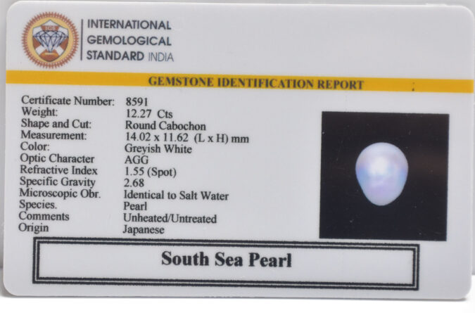 Beautiful 12.27 Cts South Sea Pearl (Unique-Mines) sva 13+ Ratti SOUTH SEA PEARL. Free Horoscope & Free Pundit Ji Astrological Advise / Consultation. Original Natural Lab certified gems by IGI GTL / Birth stones / Large Gem Selection of shree shubh Rashi Ratan Vedic dhan at Gem Mines. May Bhagwan Brahma, Vishnu, Shiv & Universe bless you.