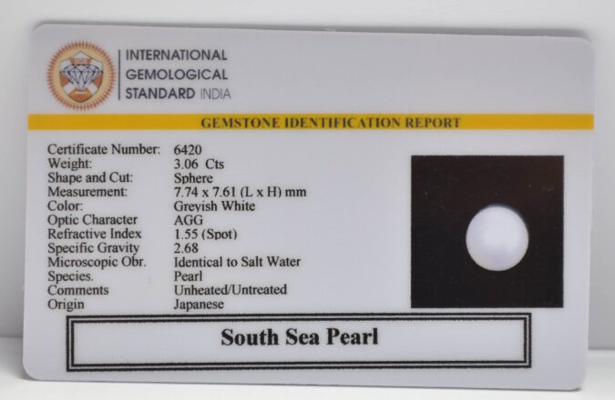 Beautiful 3.06 Cts South Sea Pearl (AAA+-Mines) sva 3+ Ratti SOUTH SEA PEARL. Free Horoscope & Free Pundit Ji Astrological Advise / Consultation. Original Natural Lab certified gems by IGI GTL / Birth stones / Large Gem Selection of shree shubh Rashi Ratan Vedic dhan at Gem Mines. May Bhagwan Brahma, Vishnu, Shiv & Universe bless you.