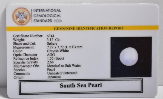Certified South Sea Pearl 3.12 Ct.(3+ Ratti) in Sphere shape
