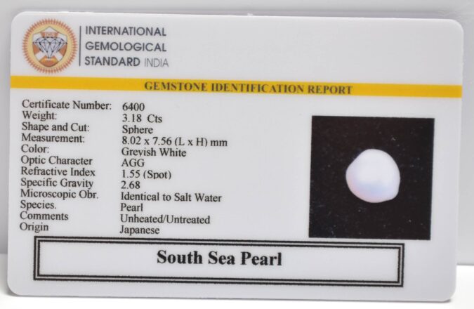 Certified South Sea Pearl 3.18 Ct.(3+ Ratti) in Sphere shape