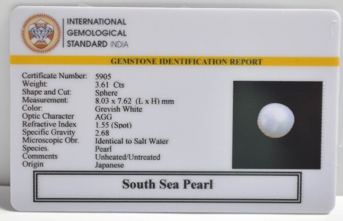 Beautiful 3.61 Cts South Sea Pearl (Top+-Mines) sva 4+ Ratti SOUTH SEA PEARL. Free Horoscope & Free Pundit Ji Astrological Advise / Consultation. Original Natural Lab certified gems by IGI GTL / Birth stones / Large Gem Selection of shree shubh Rashi Ratan Vedic dhan at Gem Mines. May Bhagwan Brahma, Vishnu, Shiv & Universe bless you.