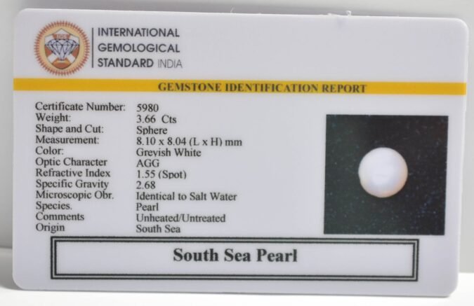 Beautiful 3.66 Cts South Sea Pearl (Top-Mines) sva 4+ Ratti SOUTH SEA PEARL. Free Horoscope & Free Pundit Ji Astrological Advise / Consultation. Original Natural Lab certified gems by IGI GTL / Birth stones / Large Gem Selection of shree shubh Rashi Ratan Vedic dhan at Gem Mines. May Bhagwan Brahma, Vishnu, Shiv & Universe bless you.