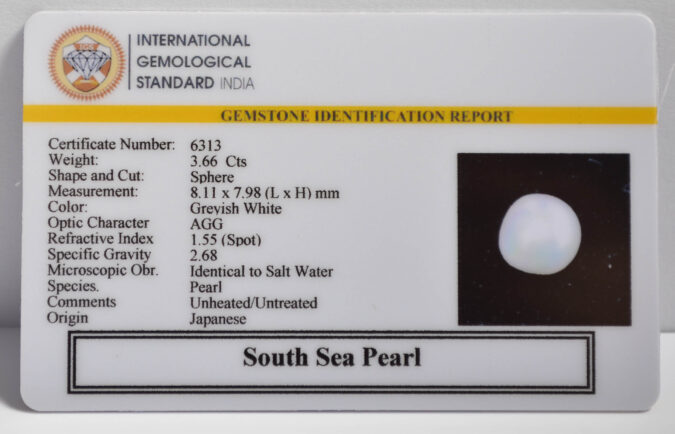 Beautiful 3.66 Cts South Sea Pearl (AAA+-Mines) sva 4+ Ratti SOUTH SEA PEARL. Free Horoscope & Free Pundit Ji Astrological Advise / Consultation. Original Natural Lab certified gems by IGI GTL / Birth stones / Large Gem Selection of shree shubh Rashi Ratan Vedic dhan at Gem Mines. May Bhagwan Brahma, Vishnu, Shiv & Universe bless you.