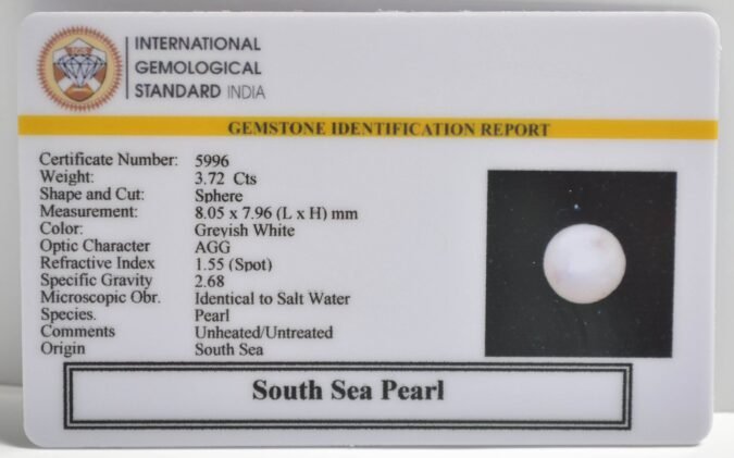 Beautiful 3.72 Cts South Sea Pearl (Top-Mines) sva 4+ Ratti SOUTH SEA PEARL. Free Horoscope & Free Pundit Ji Astrological Advise / Consultation. Original Natural Lab certified gems by IGI GTL / Birth stones / Large Gem Selection of shree shubh Rashi Ratan Vedic dhan at Gem Mines. May Bhagwan Brahma, Vishnu, Shiv & Universe bless you.