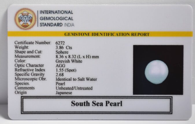 Beautiful 3.86 Cts South Sea Pearl (AAA+-Mines) sva 4+ Ratti SOUTH SEA PEARL. Free Horoscope & Free Pundit Ji Astrological Advise / Consultation. Original Natural Lab certified gems by IGI GTL / Birth stones / Large Gem Selection of shree shubh Rashi Ratan Vedic dhan at Gem Mines. May Bhagwan Brahma, Vishnu, Shiv & Universe bless you.