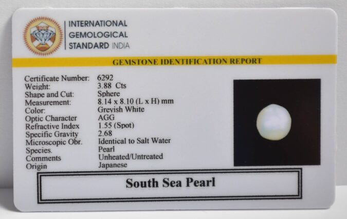 Beautiful 3.88 Cts South Sea Pearl (AAA+-Mines) sva 4+ Ratti SOUTH SEA PEARL. Free Horoscope & Free Pundit Ji Astrological Advise / Consultation. Original Natural Lab certified gems by IGI GTL / Birth stones / Large Gem Selection of shree shubh Rashi Ratan Vedic dhan at Gem Mines. May Bhagwan Brahma, Vishnu, Shiv & Universe bless you.