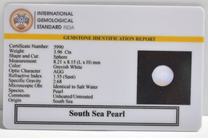 Beautiful 3.96 Cts South Sea Pearl (Top-Mines) sva 4+ Ratti SOUTH SEA PEARL. Free Horoscope & Free Pundit Ji Astrological Advise / Consultation. Original Natural Lab certified gems by IGI GTL / Birth stones / Large Gem Selection of shree shubh Rashi Ratan Vedic dhan at Gem Mines. May Bhagwan Brahma, Vishnu, Shiv & Universe bless you.