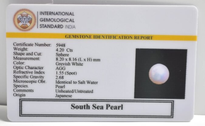 Beautiful 4.2 Cts South Sea Pearl (Top+-Mines) sva 4+ Ratti SOUTH SEA PEARL. Free Horoscope & Free Pundit Ji Astrological Advise / Consultation. Original Natural Lab certified gems by IGI GTL / Birth stones / Large Gem Selection of shree shubh Rashi Ratan Vedic dhan at Gem Mines. May Bhagwan Brahma, Vishnu, Shiv & Universe bless you.