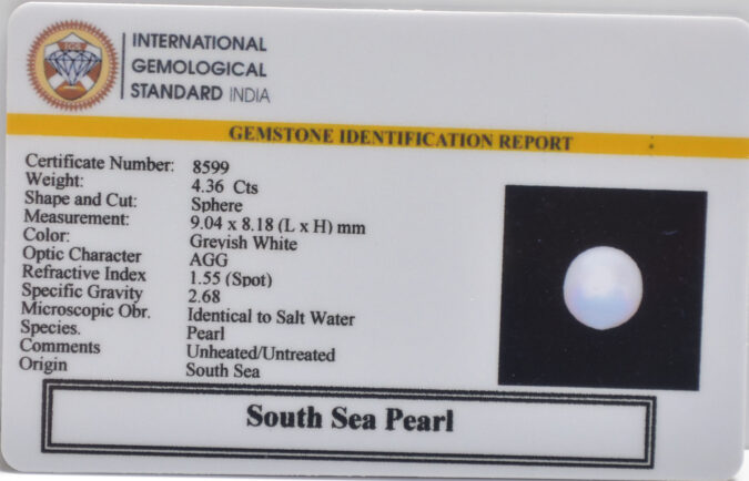 Beautiful 4.36 Cts South Sea Pearl (AAA-Mines) sva 4+ Ratti SOUTH SEA PEARL. Free Horoscope & Free Pundit Ji Astrological Advise / Consultation. Original Natural Lab certified gems by IGI GTL / Birth stones / Large Gem Selection of shree shubh Rashi Ratan Vedic dhan at Gem Mines. May Bhagwan Brahma, Vishnu, Shiv & Universe bless you.