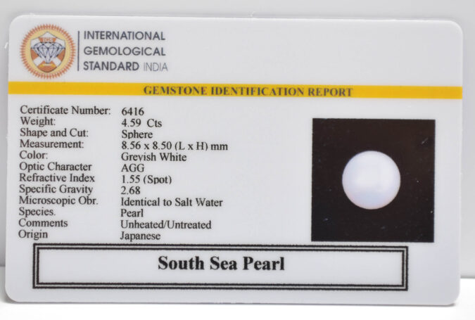 Beautiful 4.59 Cts South Sea Pearl (AAA+-Mines) sva 5+ Ratti SOUTH SEA PEARL. Free Horoscope & Free Pundit Ji Astrological Advise / Consultation. Original Natural Lab certified gems by IGI GTL / Birth stones / Large Gem Selection of shree shubh Rashi Ratan Vedic dhan at Gem Mines. May Bhagwan Brahma, Vishnu, Shiv & Universe bless you.