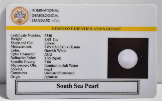 Beautiful 4.68 Cts South Sea Pearl (Top+-Mines) sva 5+ Ratti SOUTH SEA PEARL. Free Horoscope & Free Pundit Ji Astrological Advise / Consultation. Original Natural Lab certified gems by IGI GTL / Birth stones / Large Gem Selection of shree shubh Rashi Ratan Vedic dhan at Gem Mines. May Bhagwan Brahma, Vishnu, Shiv & Universe bless you.