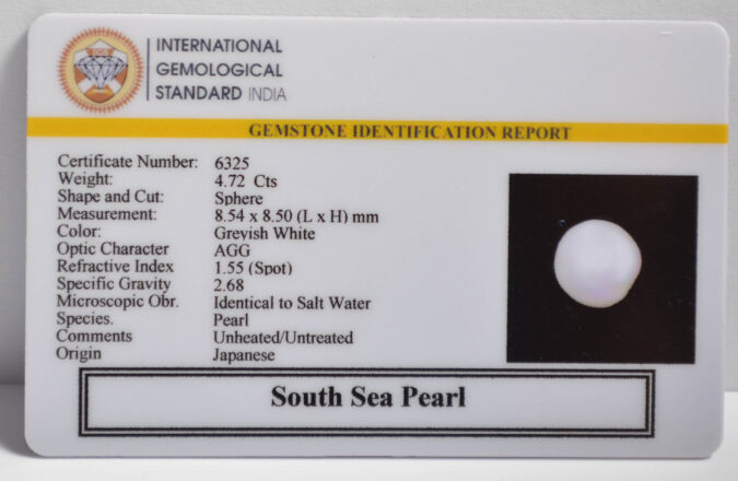 Beautiful 4.72 Cts South Sea Pearl (Top+-Mines) sva 5+ Ratti SOUTH SEA PEARL. Free Horoscope & Free Pundit Ji Astrological Advise / Consultation. Original Natural Lab certified gems by IGI GTL / Birth stones / Large Gem Selection of shree shubh Rashi Ratan Vedic dhan at Gem Mines. May Bhagwan Brahma, Vishnu, Shiv & Universe bless you.